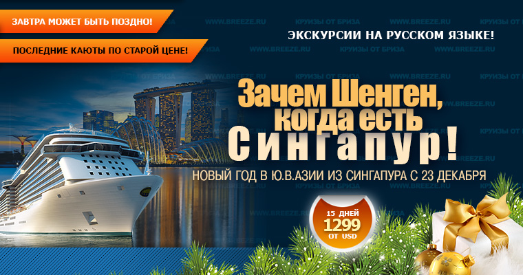 Морские круизы от Бриза - это удобно и безопасно! Во время круиза Вам не надо разбирать и собирать чемоданы несколько раз, чтобы посетить за одну поездку несколько стран! Ну а по статистике круизные лайнеры - самый безопасный вид транспорта!