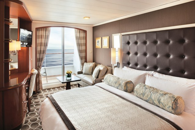 Просторная гостиная с диваном, столовая, личная веранда, спальня с двуспальной / двумя односпальными кроватями, ванная комната с ванной-джакузи, отдельный душ, гардероб, цветной плоский телевизор и DVD плейер, минибар, бесплатные безалкогольные напитки, пиво и вода в бутылках в каюте, бесплатное вино и ликер в минибаре при посадке, персональный дворецкий, сейф. Дополнительные бесплатные услуги: ПЕРСОНАЛЬНЫЙ ДВОРЕЦКИЙ, бесплатная электронная почта и вай-фай - 60 мин\чел в день, глажка одежды. Площадь каюты 37 кв. м.