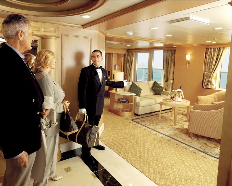Самые роскошные сьюты на борту лайнера площадью до 197 м.2. Каждая каюта оборудована персональным балконом с шезлонгами, столиком, стульями, отдельной гостиной зоной, спальней с большой кроватью, гардеробом, а ванная комната оборудована мраморной ванной с джакузи и душем, док-станция для iPod.