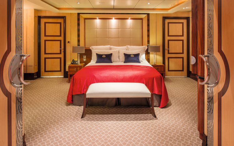 Самые роскошные сьюты на борту лайнера площадью до 210 м.2. Каждая каюта оборудована персональным балконом с шезлонгами, столиком, стульями, отдельной гостиной зоной, спальней с большой кроватью, гардеробом, а ванная комната оборудована мраморной ванной с джакузи и душем, док-станция для iPod.