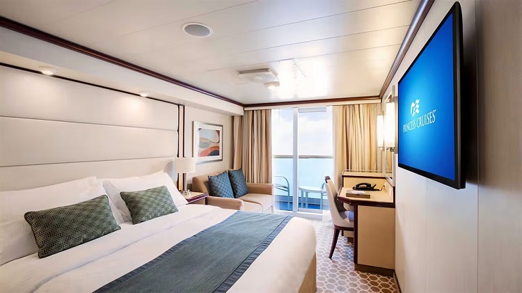 Каюта с балконом обладает теми же характеристиками, что и каюты без окна и с окном, но дополнительно оборудована балконом со столиком и стульями. Площадь каюты составляет 22 кв.м.