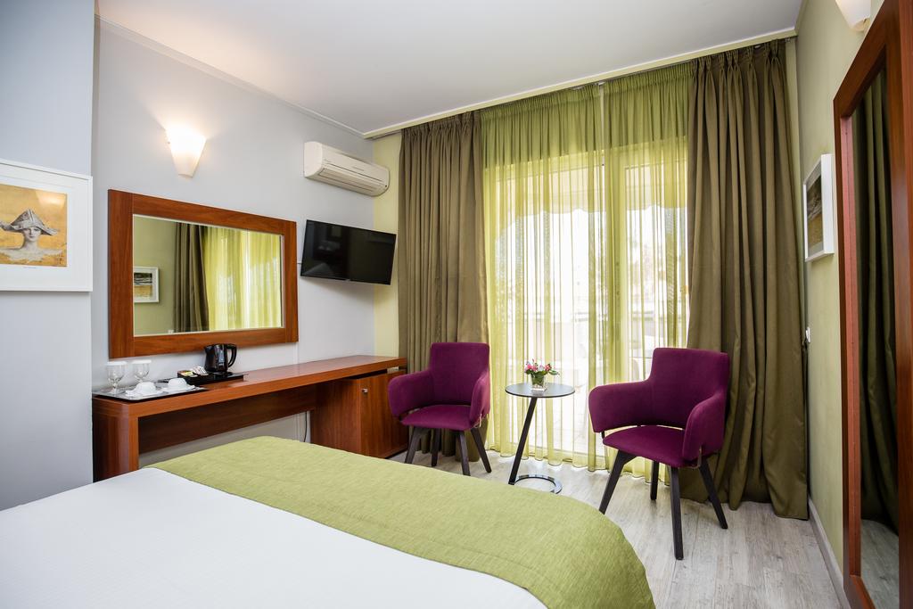 В номере: Номера гранд-отеля Polis обставлены элегантной мебелью, и в них обустроена отделанная мрамором ванная комната. В распоряжении гостей кондиционер, сейф для ноутбука и телевизор с плоским экраном. В некоторых номерах есть балкон с видом на холм Ликавит и Акрополь.